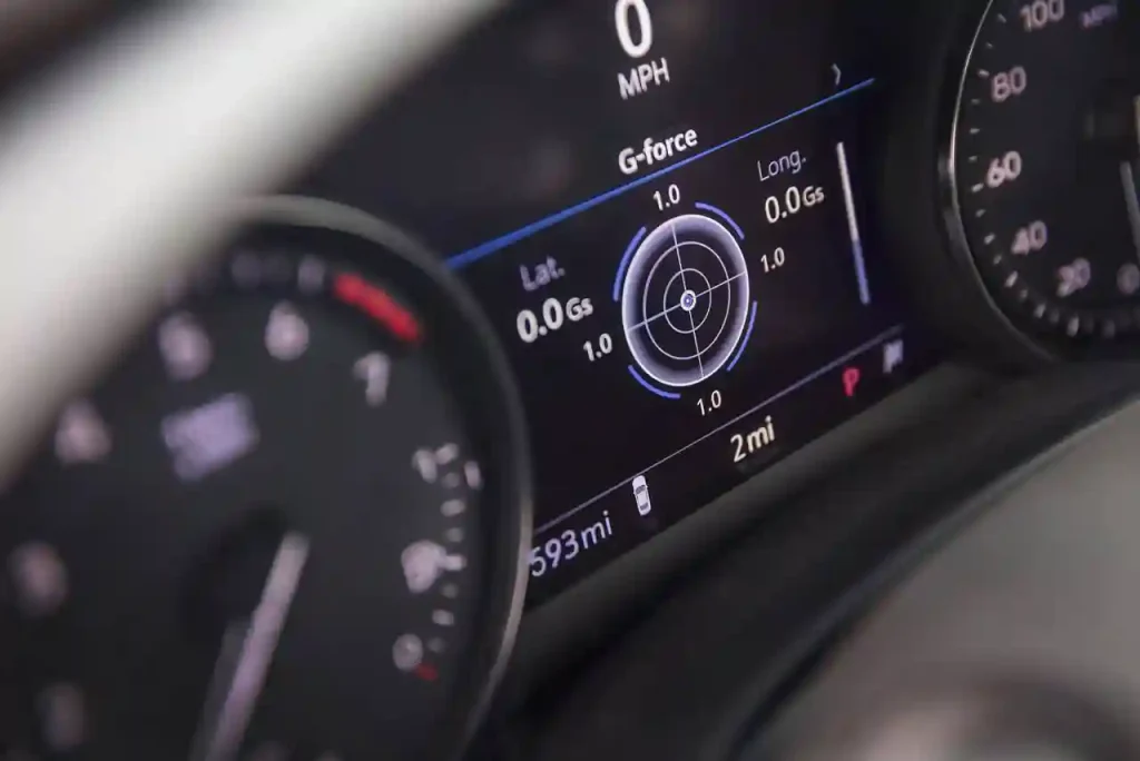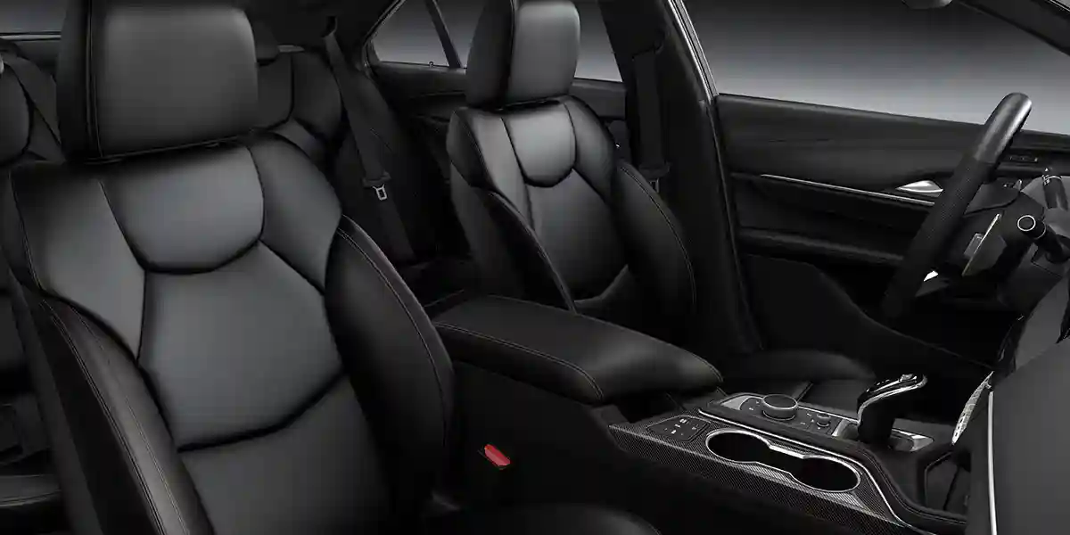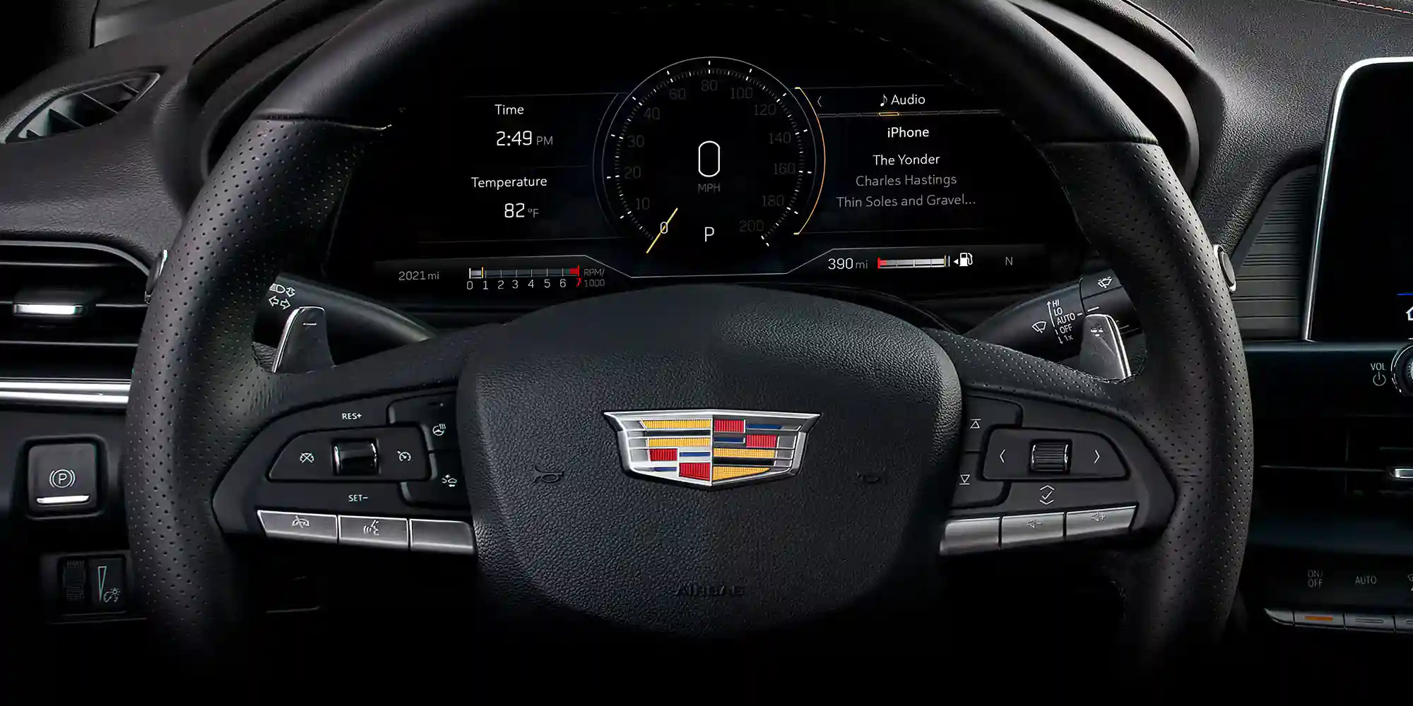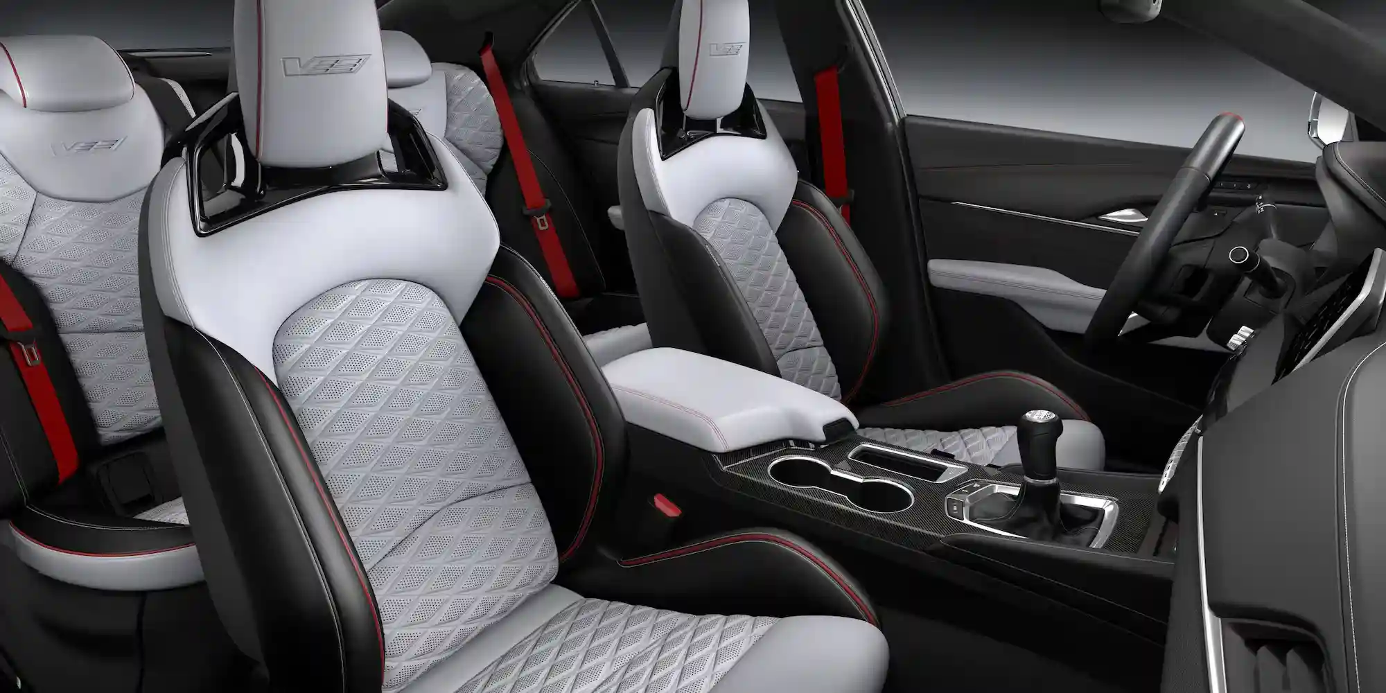 Standard equipment includes a 12.0-inch digital gauge cluster and specially bolstered front seats with 18-way power adjustments and heated cushions. These seats can be upgraded to an even more aggressive set with ventilation, lumbar massage, and enhanced bolstering. Cargo space matches the regular CT4, with practical cubbies and a trunk that accommodated five carry-on suitcases in our testing, making it both sporty and surprisingly practical.