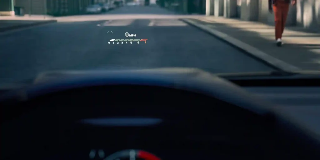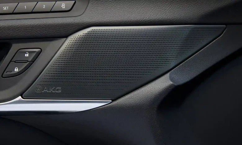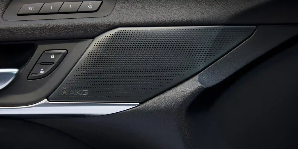 Audio is handled by a 14-speaker AKG stereo system with brushed aluminum grilles and lightweight components, delivering crisp, powerful sound that complements the car’s sporty cabin.