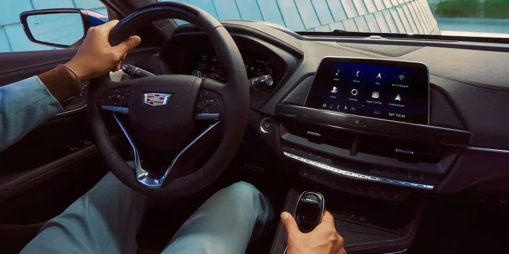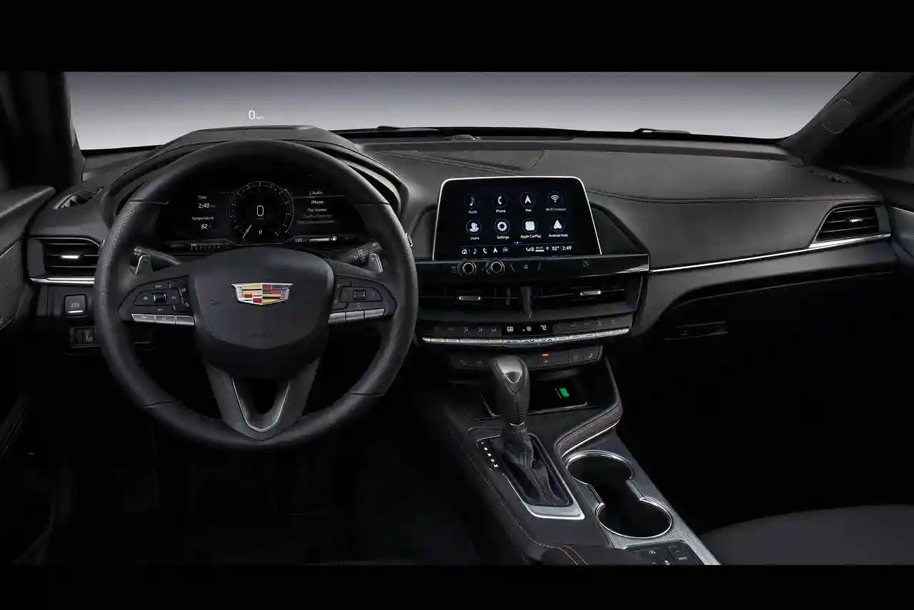 Every 2025 Cadillac CT4-V Blackwing comes equipped with an 8.0-inch touchscreen infotainment system featuring Apple CarPlay, Android Auto, wireless smartphone charging, and multiple USB ports. Cadillac has moved beyond its old CUE interface, replacing the nearly all-touch setup with a convenient rotary knob and physical buttons for easier operation.