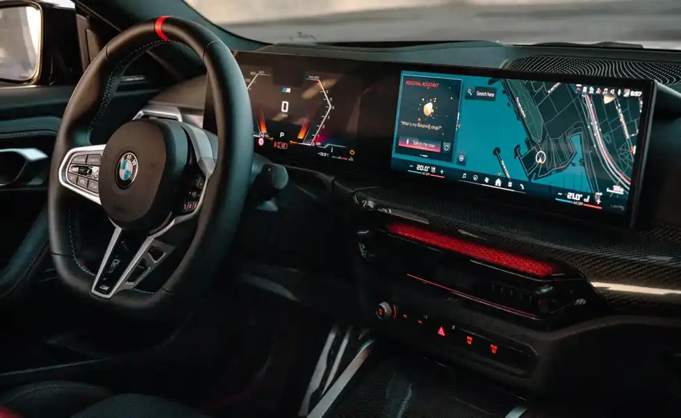The driver is greeted by a sweeping glass panel housing a 12.3-inch digital instrument cluster and a 14.9-inch infotainment screen. The system runs BMW’s iDrive 8.5 software and supports Apple CarPlay and Android Auto wirelessly. Inputs can be made via touchscreen taps, the control pad, or voice commands.