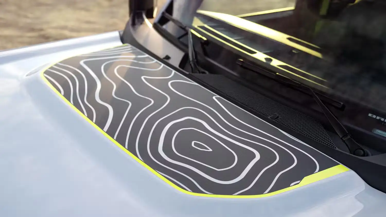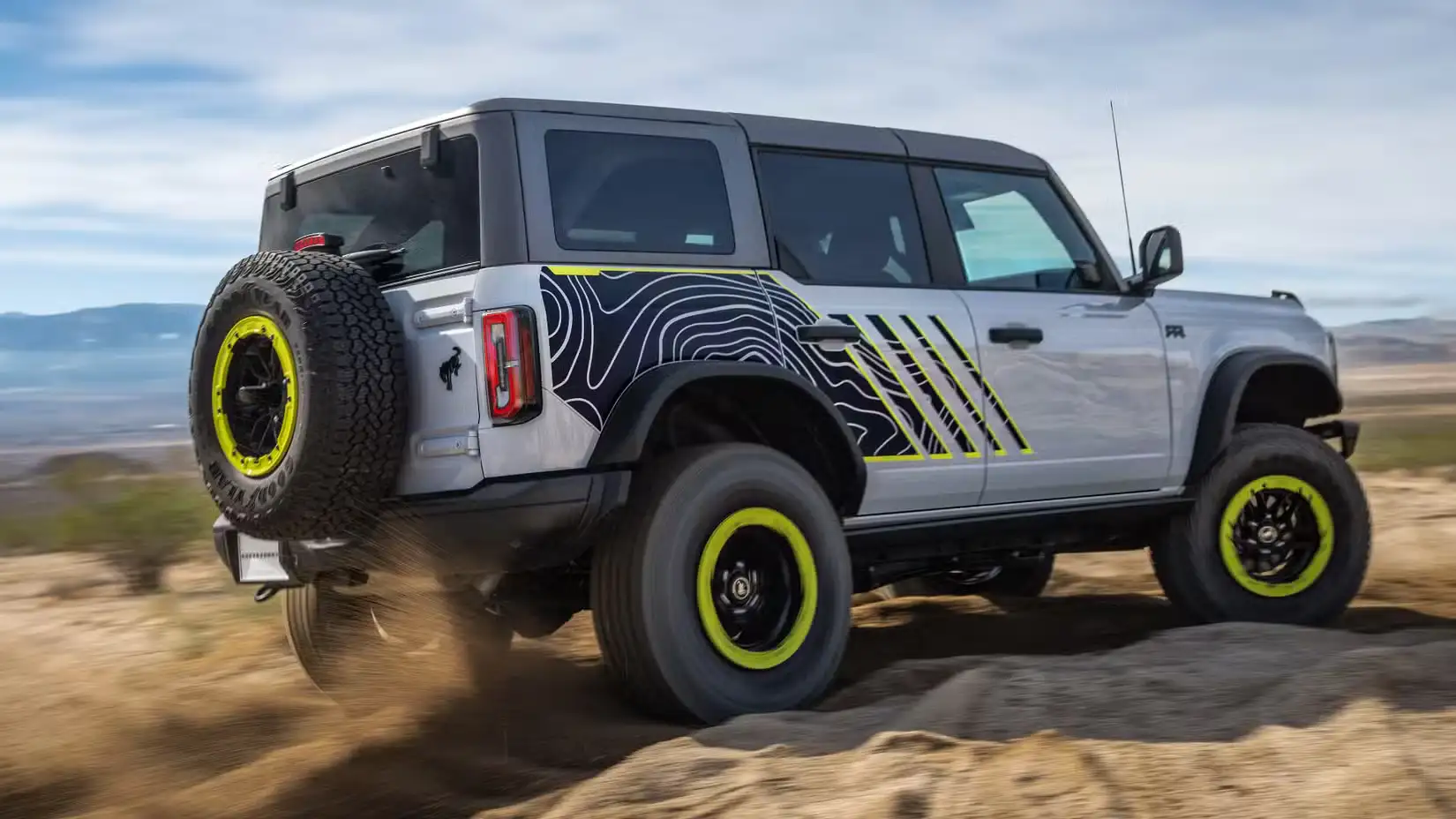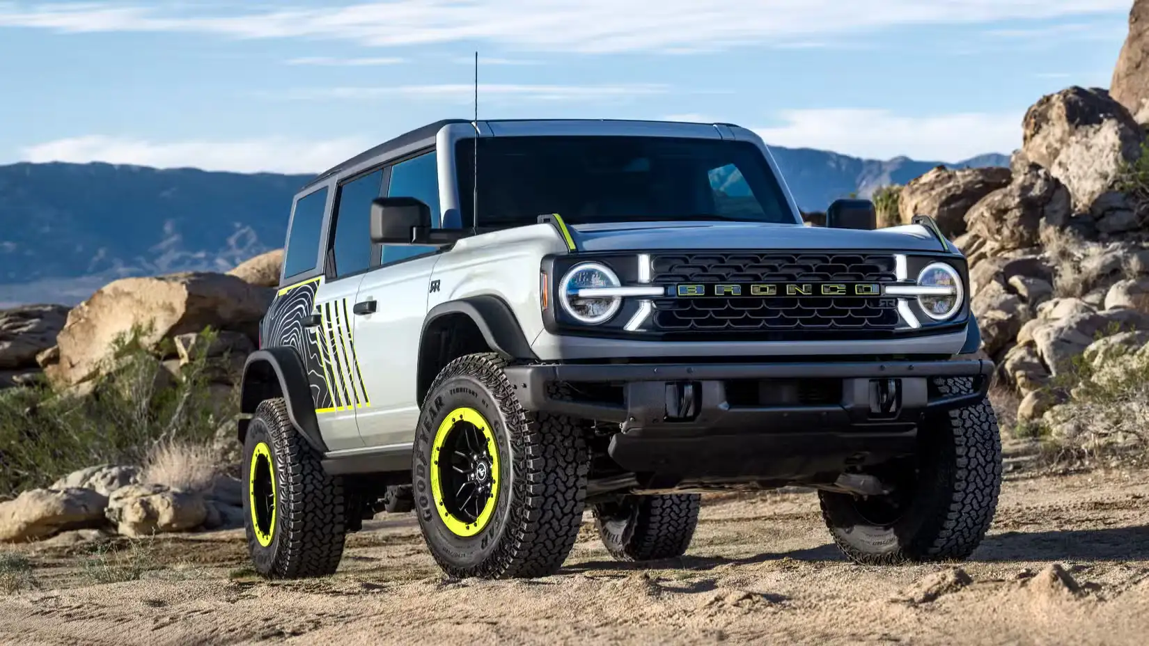 The 2027 Ford Bronco RTR also stands out with a number of unique visual elements. It wears a new RTR grille accented by signature hockey-stick lighting, along with Hyper Lime body graphics and matching rock rings on its 17-inch beadlock-capable wheels. Additional graphics run along the sides and across the hood, depicting the topography of Johnson Valley, California—the rugged terrain where Ford put the Bronco RTR through its testing program.