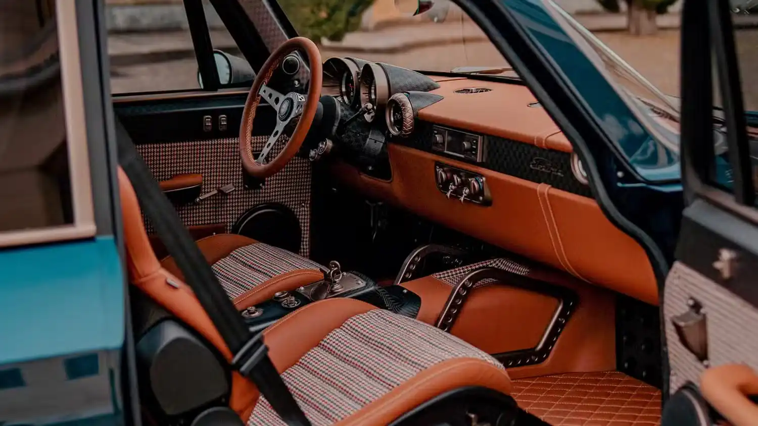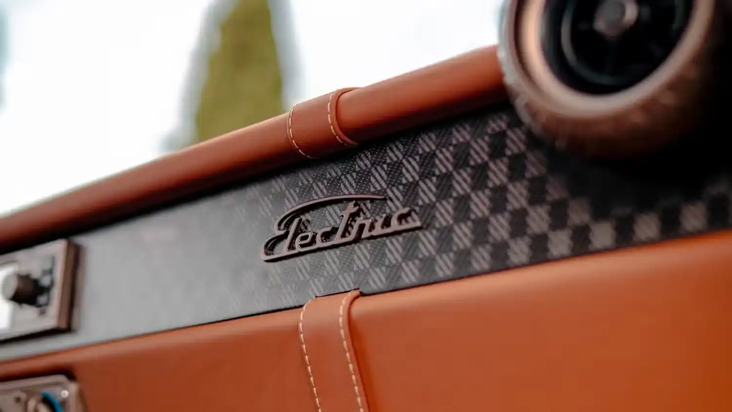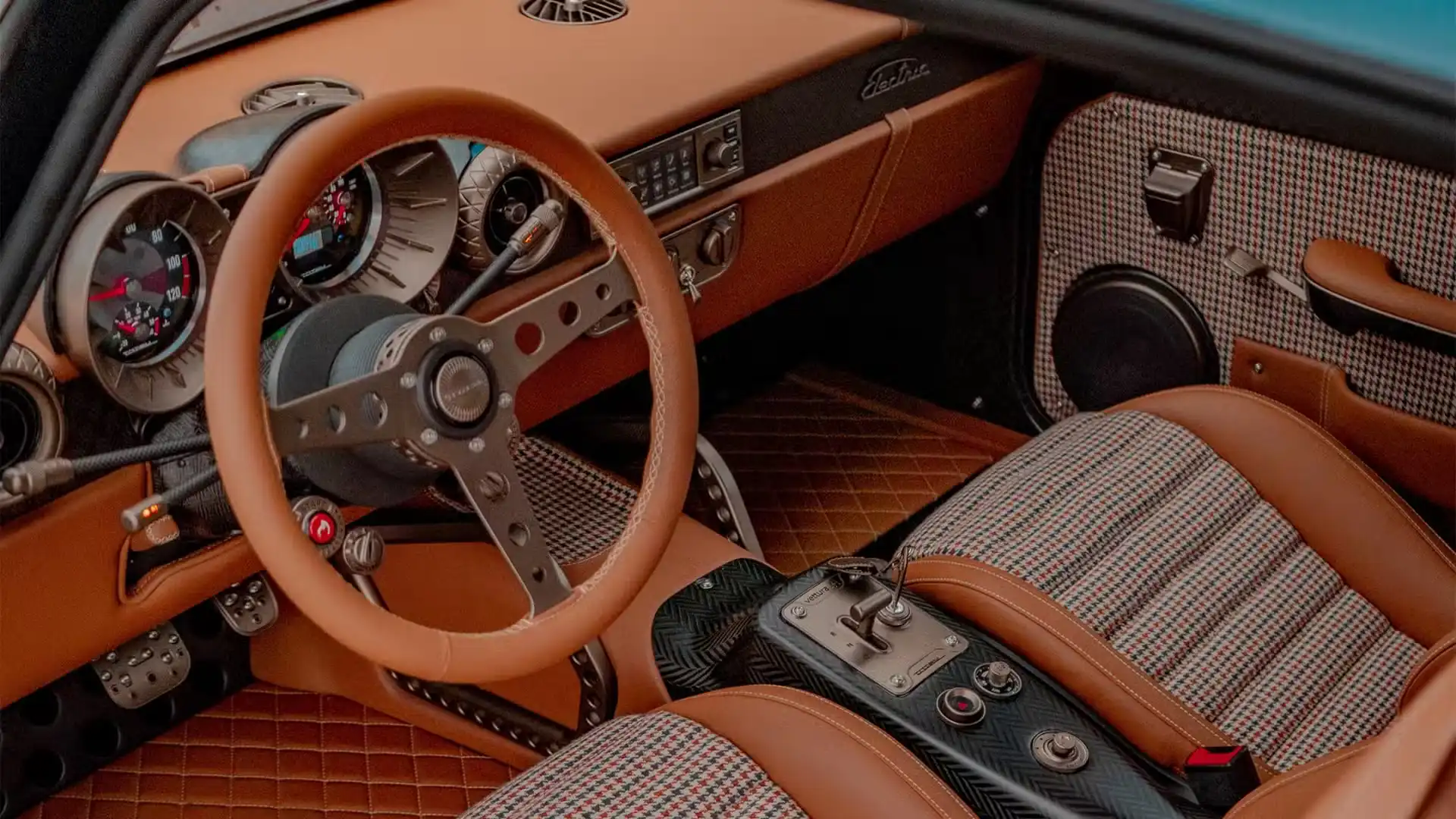 The cabin mirrors the exterior’s subtle elegance, trimmed in Truffle Brown Nappa leather and a bespoke houndstooth fabric created specifically for Amelie. The seatbacks and center console feature the same herringbone carbon weave found on the bodywork, creating a cohesive design theme, while the door panels and instrument cluster showcase Totem’s signature checkerboard carbon pattern. Modern tech is neatly integrated as well, including a contemporary infotainment setup—almost certainly a Porsche Classic Communication Management touchscreen—discreetly concealed behind Totem-specific trim.