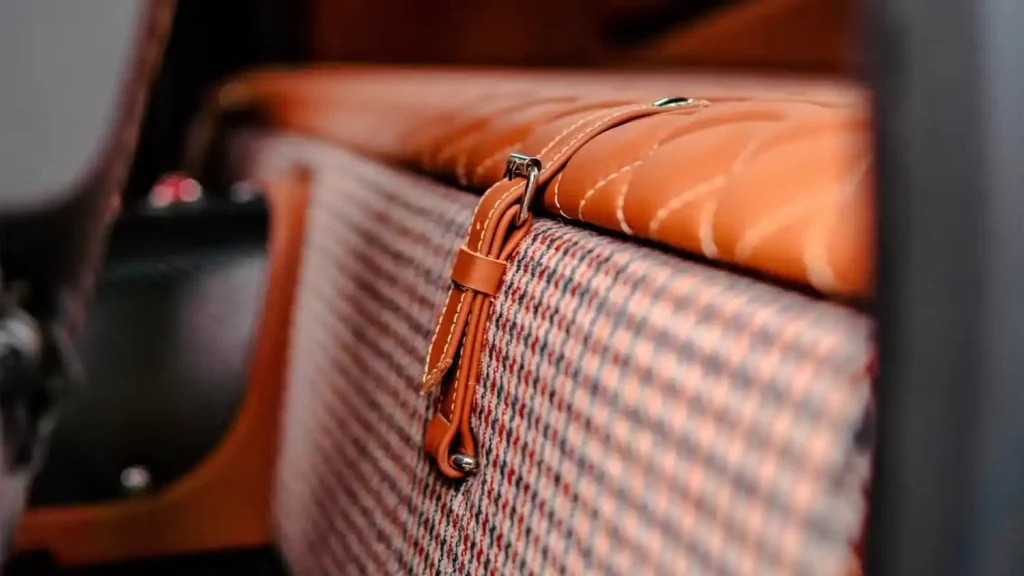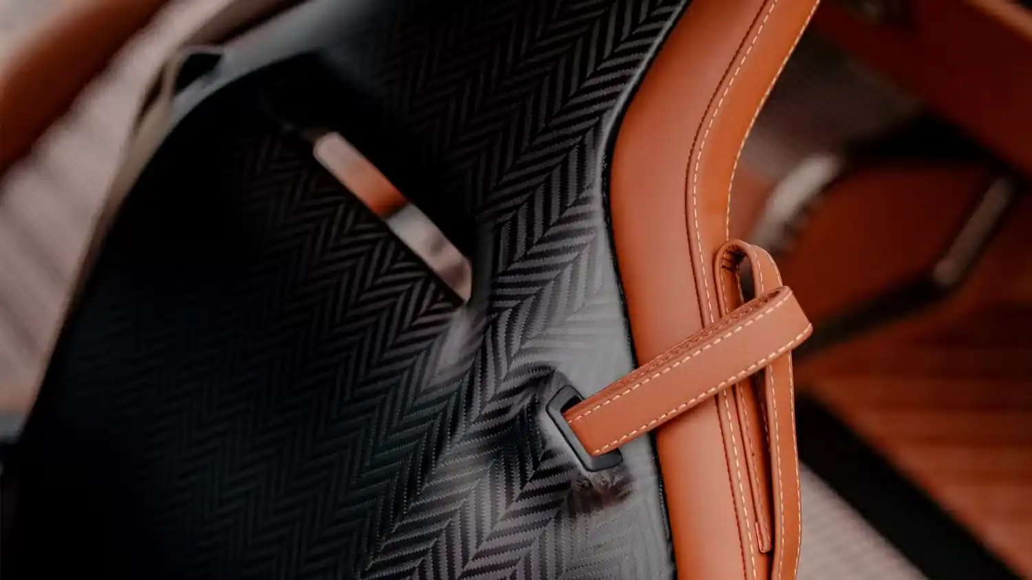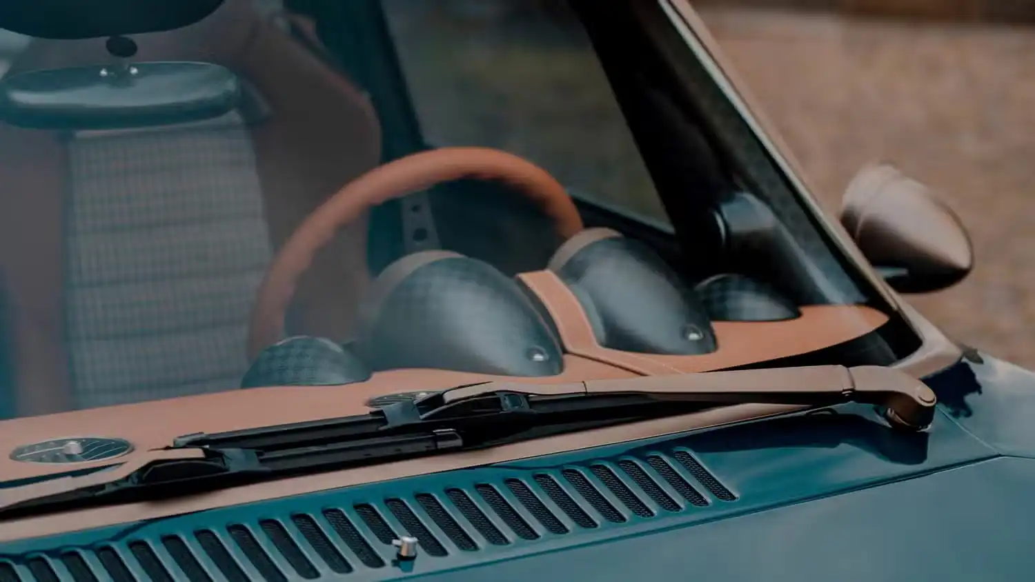 The cabin mirrors the exterior’s subtle elegance, trimmed in Truffle Brown Nappa leather and a bespoke houndstooth fabric created specifically for Amelie. The seatbacks and center console feature the same herringbone carbon weave found on the bodywork, creating a cohesive design theme, while the door panels and instrument cluster showcase Totem’s signature checkerboard carbon pattern. Modern tech is neatly integrated as well, including a contemporary infotainment setup—almost certainly a Porsche Classic Communication Management touchscreen—discreetly concealed behind Totem-specific trim.