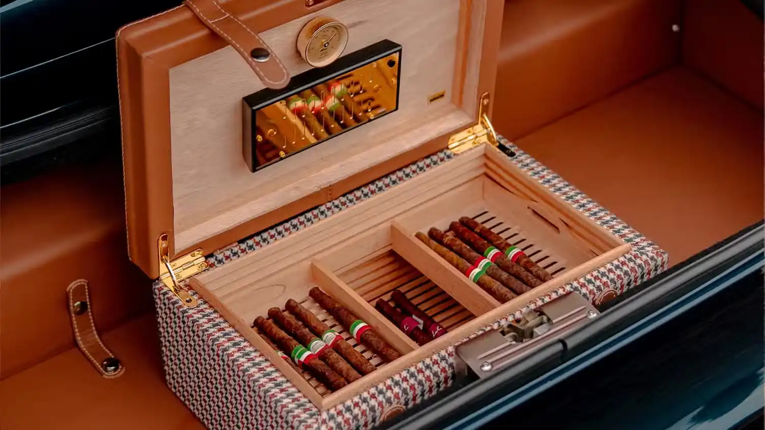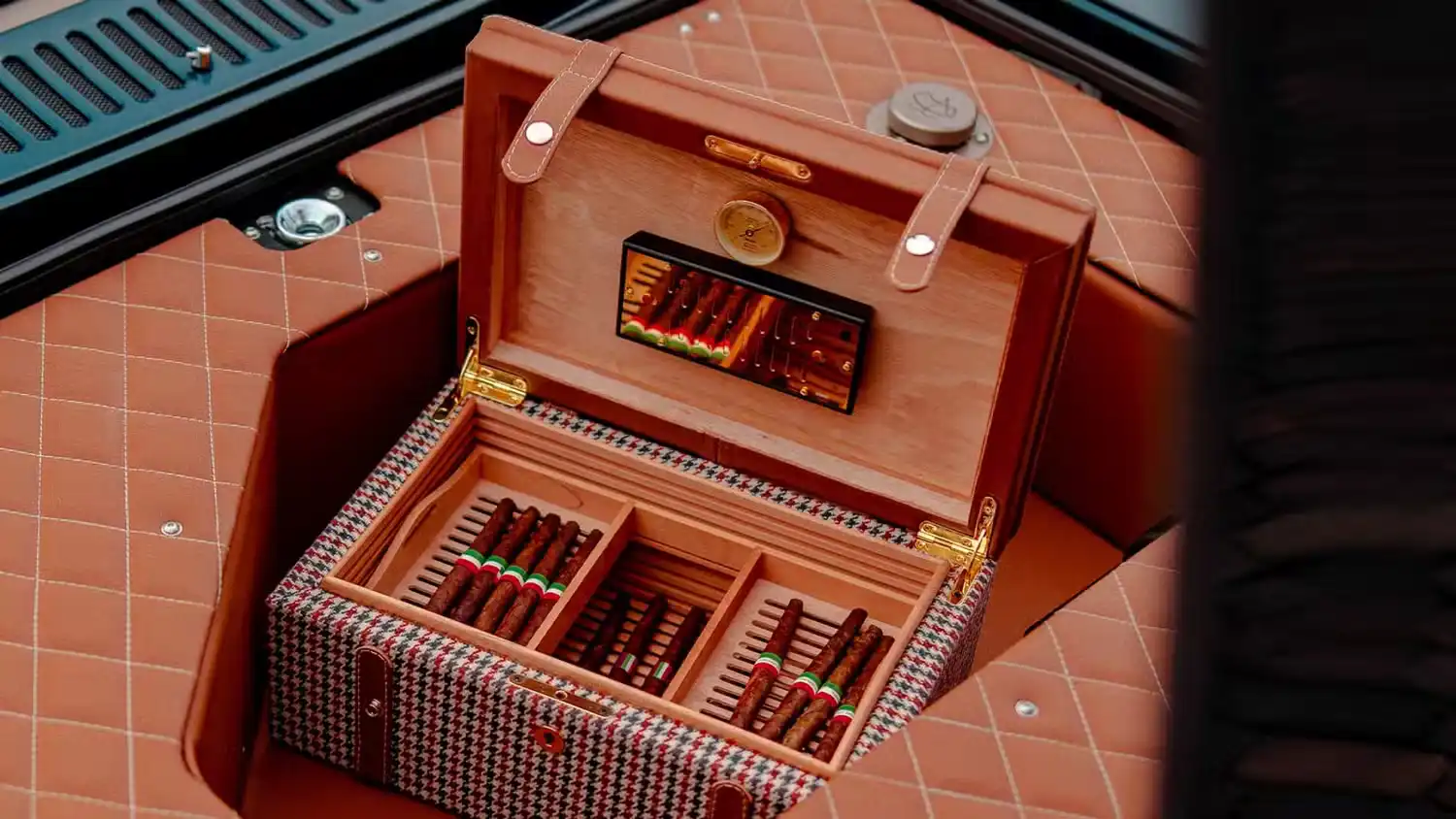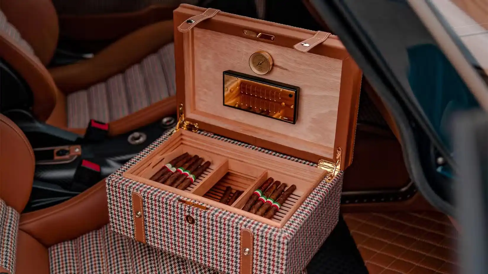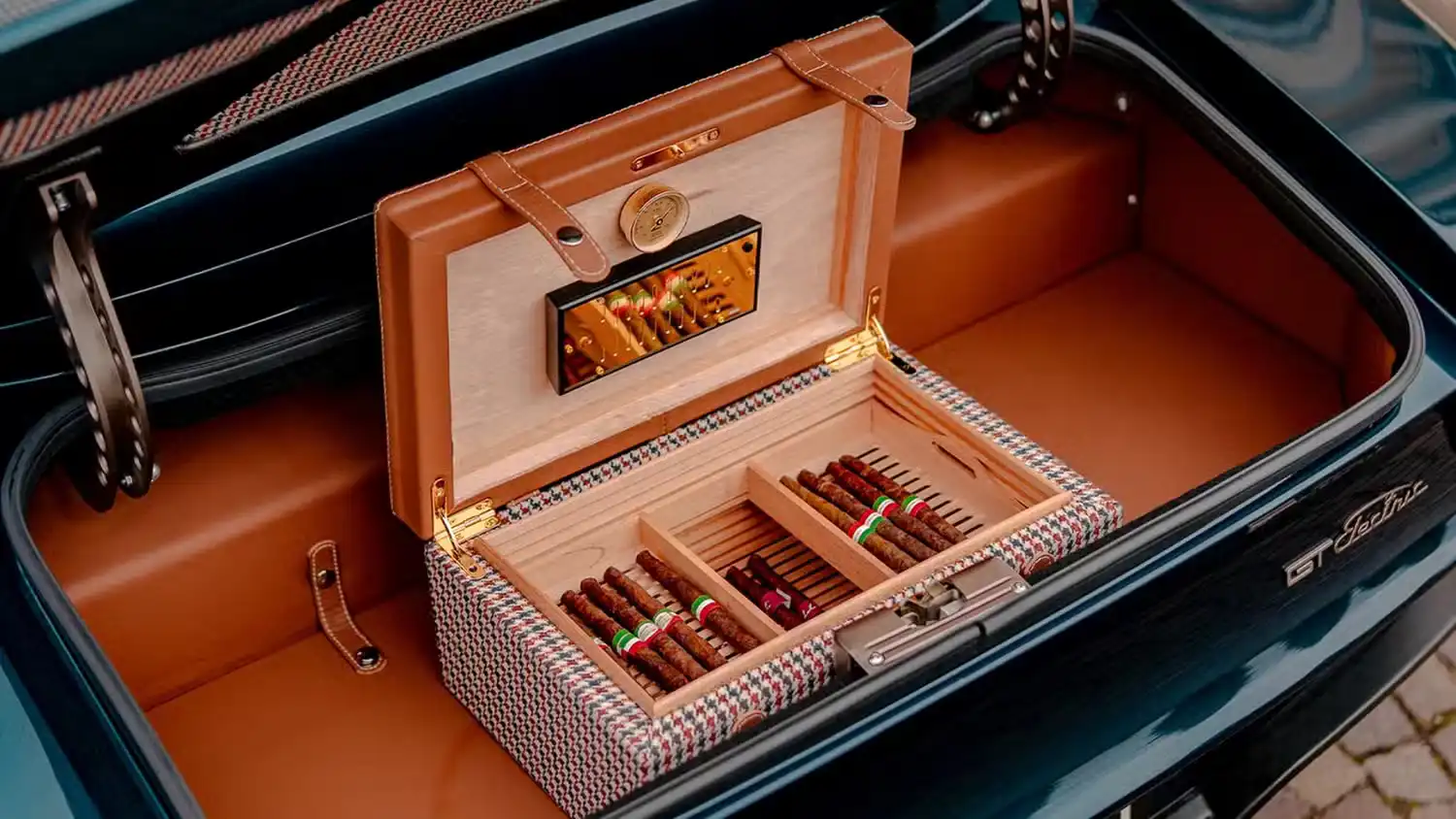 One of the standout bespoke features Totem created for this GT Electric is a custom cigar humidor, crafted with the same leather and fabric used throughout the cabin. Built exclusively for Amelie, the humidor reflects the owner’s personal tastes while highlighting Totem’s talent for true one-off customization. The box is designed to fit perfectly in the rear boot, the small frunk beneath the hood, or even on the rear parcel shelf of the two-seat interior. And if anyone asks, you can always claim it’s meant for safely transporting family keepsakes or miniature works of art.