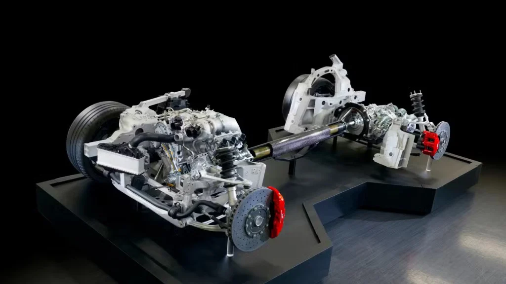 This is the first Toyota ever built with a full aluminum body frame. The structure uses large cast components to boost rigidity, while advanced fastening techniques and lightweight alloys help keep overall mass down. To further balance strength and weight, the GR GT’s body panels combine aluminum with carbon fiber, giving the car a chassis that’s both lighter and more robust.