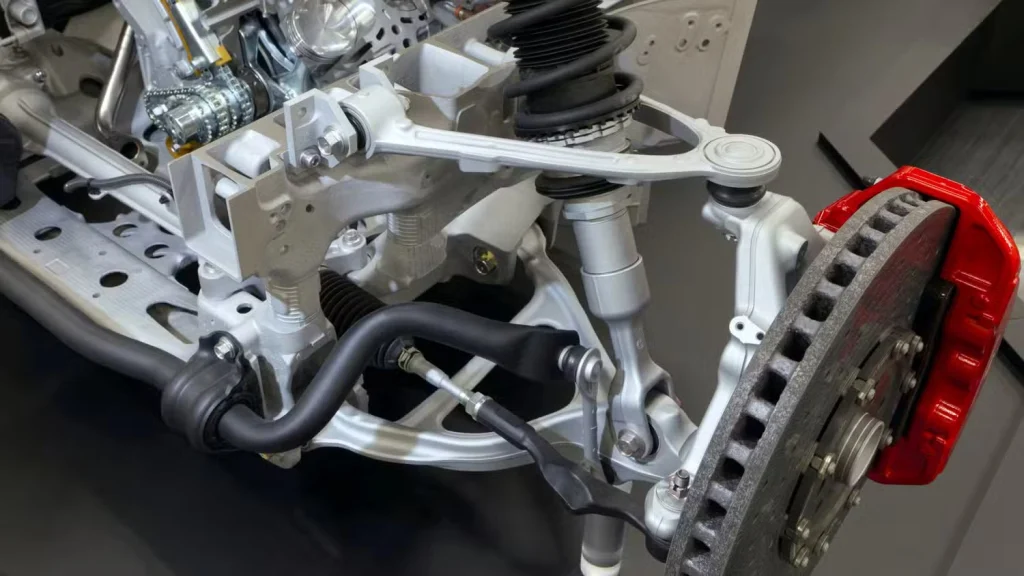The Toyota GR GT rides on double-wishbone suspension at both the front and rear, using aluminum control arms and a design focused on linear response and precise control. Toyota says many of the core components are shared with the GT3 race car, hinting at serious durability and track-worthy handling.